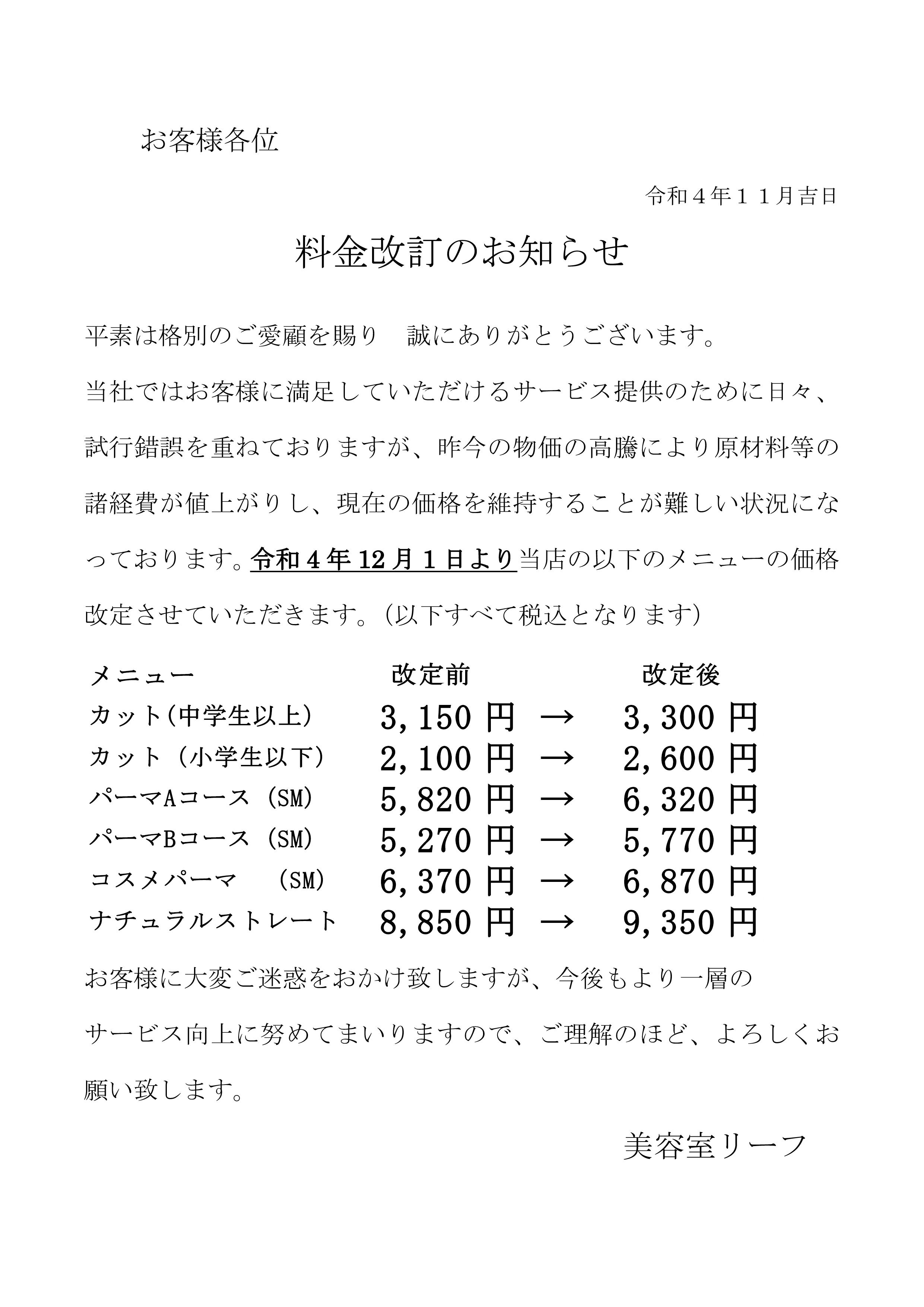 料金改定のお知らせ | 美容室たんぽぽ・美容室リーフ 岐阜・愛知の年中無休ご予約不要の美容室